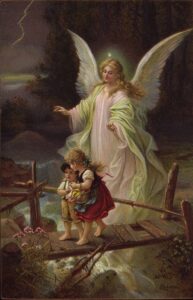 On our family kitchen wall for all to see was a picture of two children crossing a broken down bridge over a raging torrent with an angel looking over, guiding and protecting them. The picture was so ubiquitous that we hardly ever noticed it. The belief in our guardian angels was so ingrained we assumed it was real. We prayed beneath that picture for protection from storms and safe travels on many occasions.